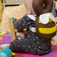 This little bee backpack has literally been a life saver. My 10 month old has been wearing it consistently for the past month and a half and it has saved him from smacking the back of his head on our tile floors too many times to count. He was a little interested in trying to pull it off when we first put it on, but now he wears it all the time and doesn’t seem to even notice it is there. Such a simple, cheap, and effective solution for a common baby issue.