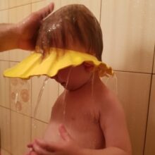 We enjoy using the baby shower cap and feel that it does a great job of keeping water away from face. Only negative is that it tends to slide down from time to time.
