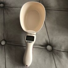 I think a wonderful idea, but sticks. I cannot use the scoop to scoop and weigh, I havs to use another scoop to gently put the dog bisciut in and it seems to get to around 65g and stops, to by pass this I have to press scoop it goes up and then comes back to a weight…but this is mainly for our holidays so that I do not have to take scales with me to weigh my dogs meals!..Love the idea just needs tweaking!..I have lived with a set of digital scales without 75g on for an eternity..I am sure I can givean extra press to vet rhe right weight! As accurate as my salter kitchen scales..once pressed and added or taken food out to get 76g..