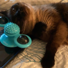 My cat just loves this toy! We have it on the window by our bathtub and she’s always running to spin the toy. She even rubs her head on the center to itch her head which she never does with other cat toys. I love the little blinking ball that goes inside one of the sides of the spinners. My cat will watch the lights blink and go back to spin the toy so they will blink again. Definitely keeps her interest and worth every penny! Highly recommend!